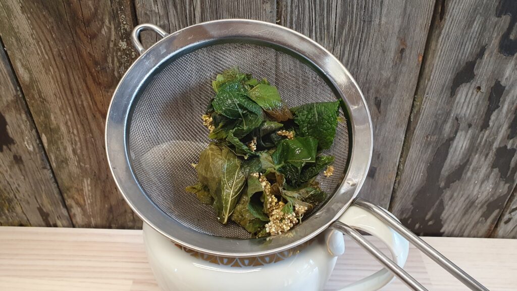 Die Kräuter und Blüten von den Stängeln zupfen und mit Wasser aufkochen.