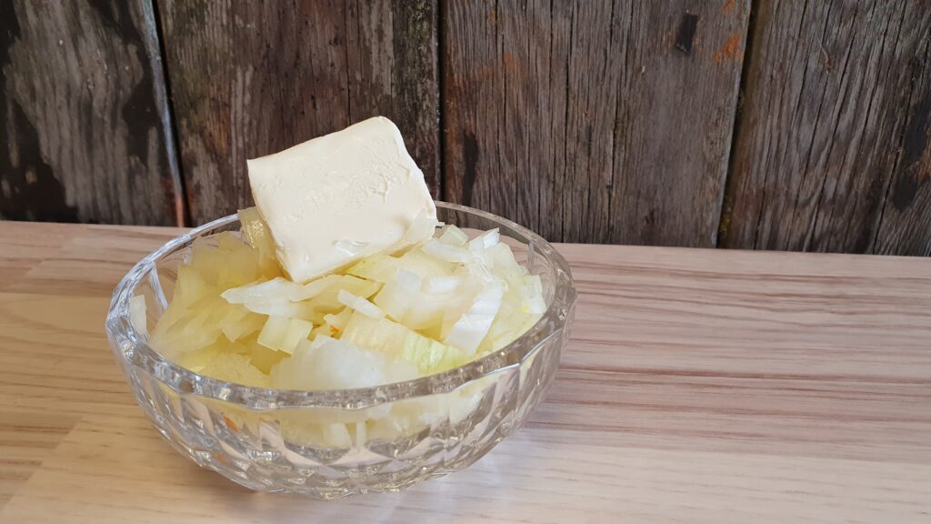 Zwiebel klein schneiden, auf mittlerer Hitze ca. 5 min in der Margarine anschwitzen und leicht anrösten.