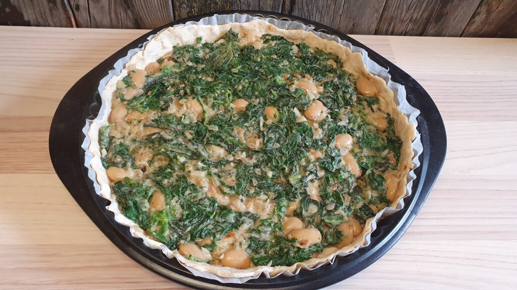 Den Kuchen- oder Blätterteig in der Form auslegen und die Brennnessel-Masse darauf verteilen.