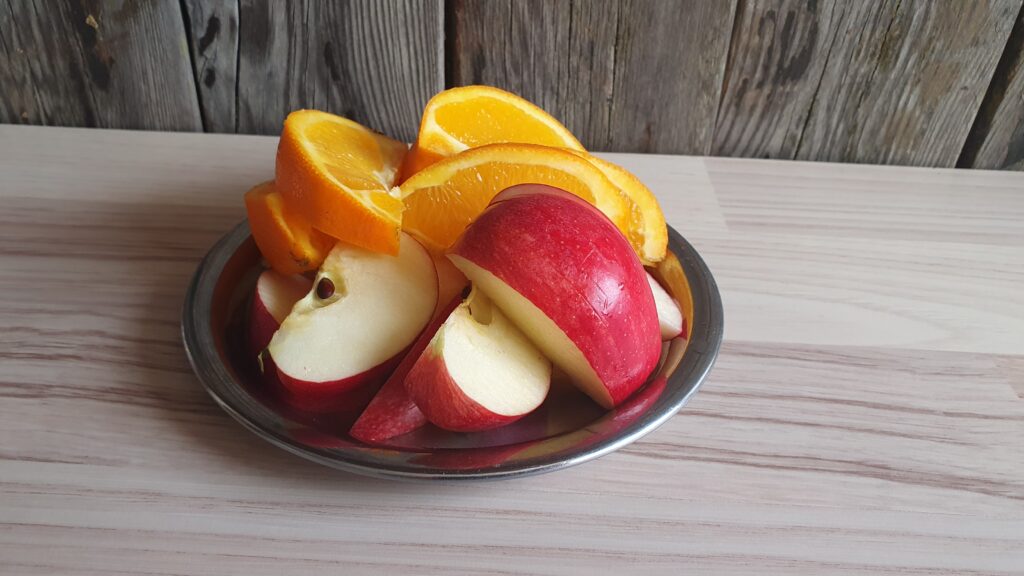 Apfel und Orange klein schneiden. Falls du keine unbehandelten Früchte findest, empfehlen wir dir den Apfel zu schälen bzw. die Orange auszupressen und nur den Saft zu verwenden.