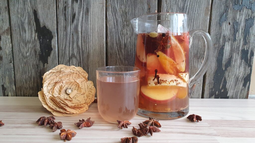 1.5 l Wasser zum Kochen bringen und über die Früchte und Gewürze giessen.