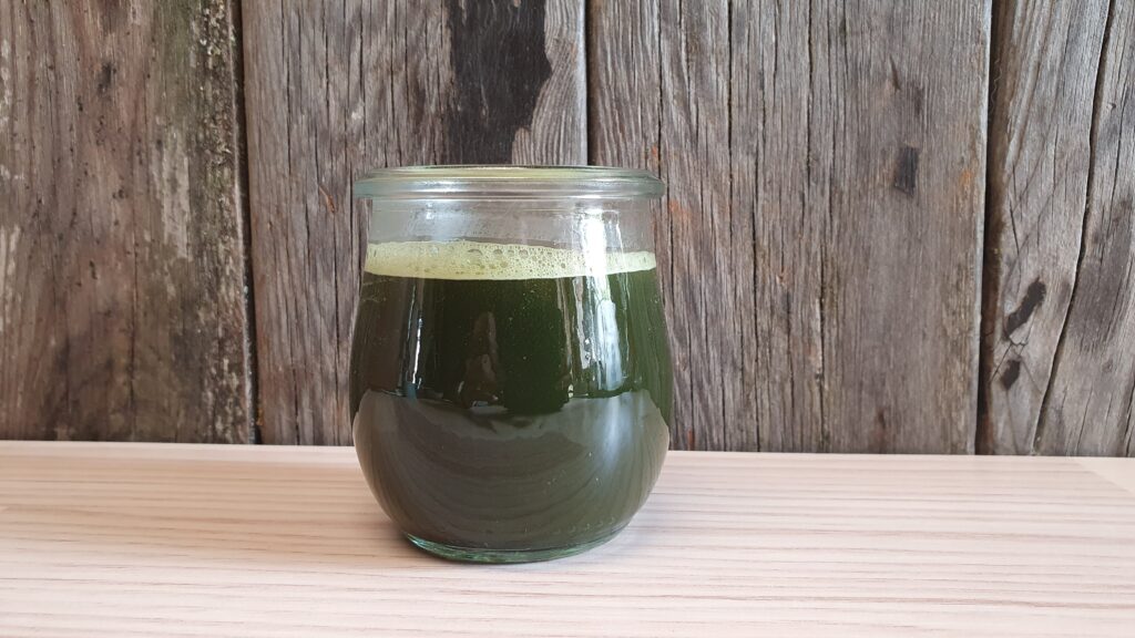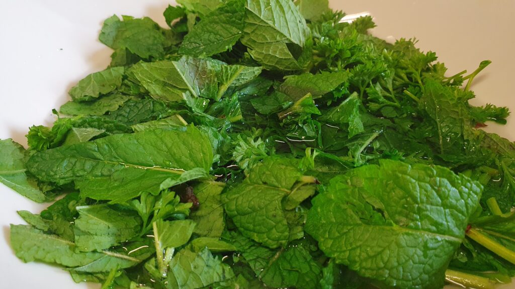 Pfefferminze und Petersilie mitsamt den Stängeln klein schneiden und mit 250 ml siedendem Wasser übergiessen. Ca. 5 min ziehen lassen.