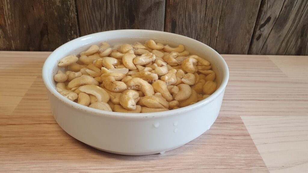 Die Cashew-Nüsse in heissem Wasser einlegen und ca. 30 min aufweichen lassen. Danach das Wasser wegschütten.