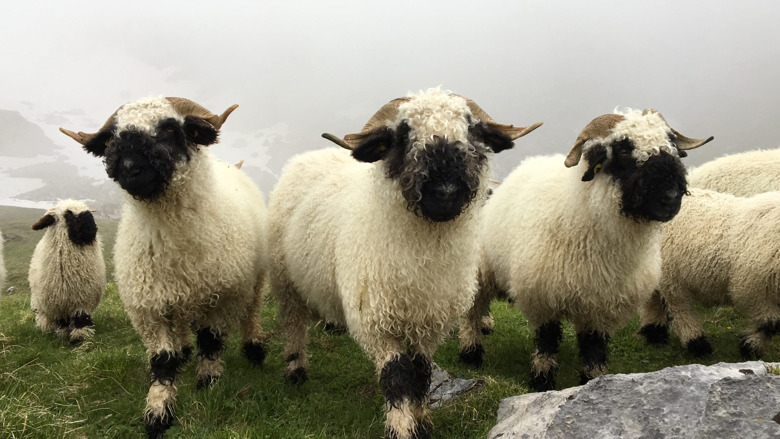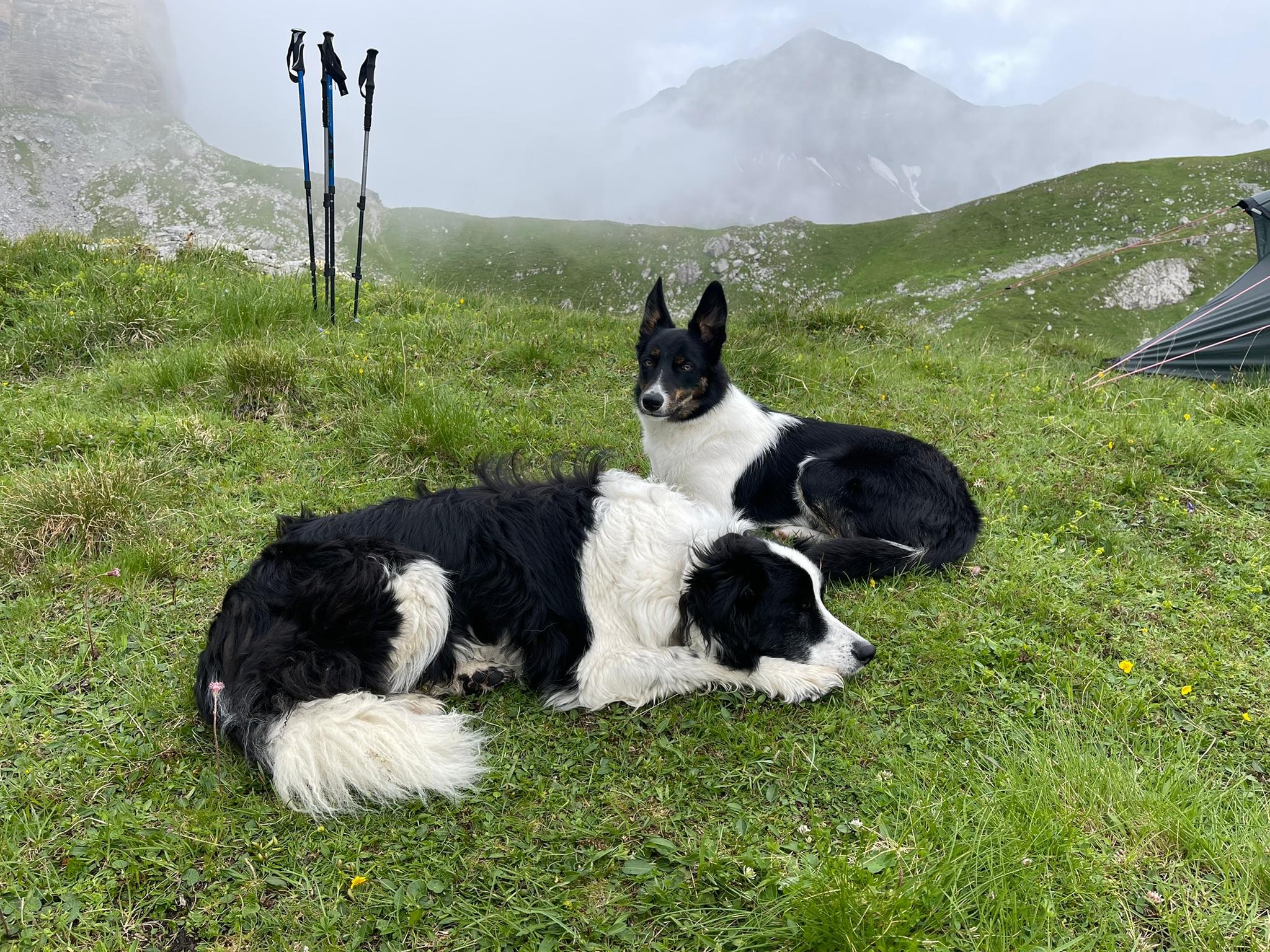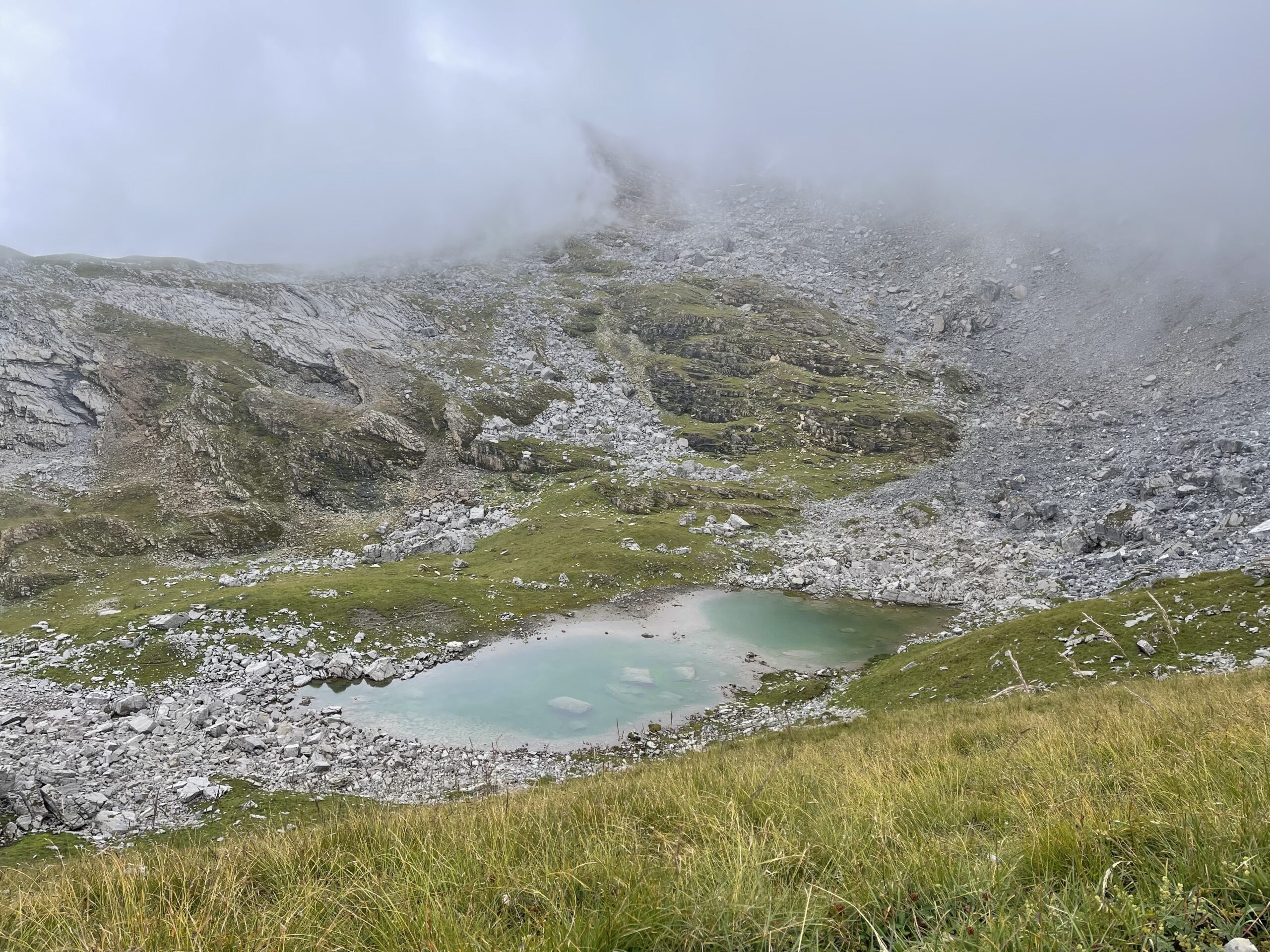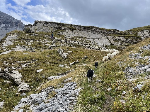 Die Erfahrung lehrt uns, Informationen von Passanten immer mit einer gewissen Skepsis zu begegnen. Dennoch, erfüllt von Besorgnis, dass „irgendwo“ unsere Alp, und das „Schaf“ eines unserer Herde sein könnte, machen wir uns so schnell wir nur können auf den Weg. Wir wählen die Route mit der besten Aussicht – dem anfänglichen Nebel zum Trotz. Endlich angekommen suchen wir zunächst unsere Alp ab. Aber wir finden kein Schaf in einer Felsspalte. Unsere Herde befindet sich friedlich aneinander gekuschelt in der Mittagsruhe.