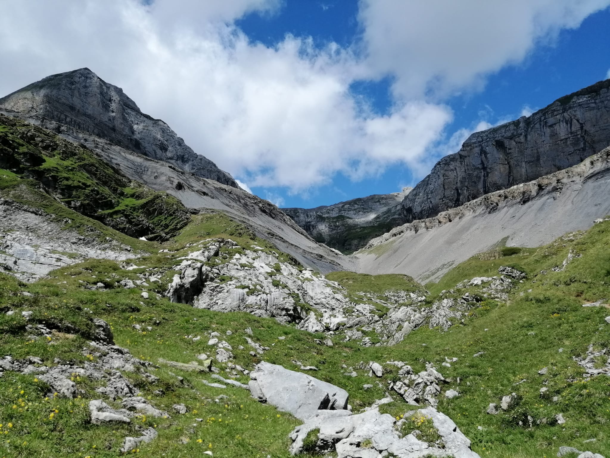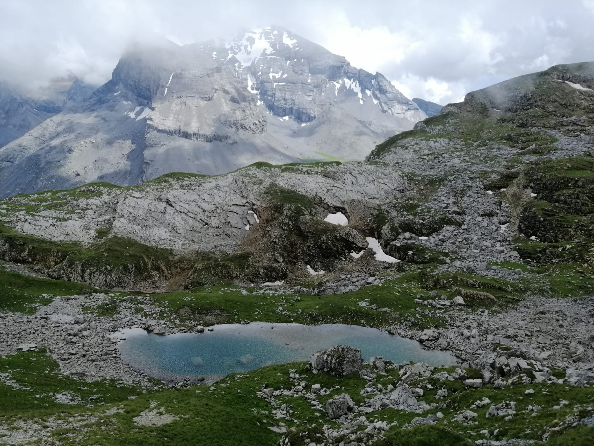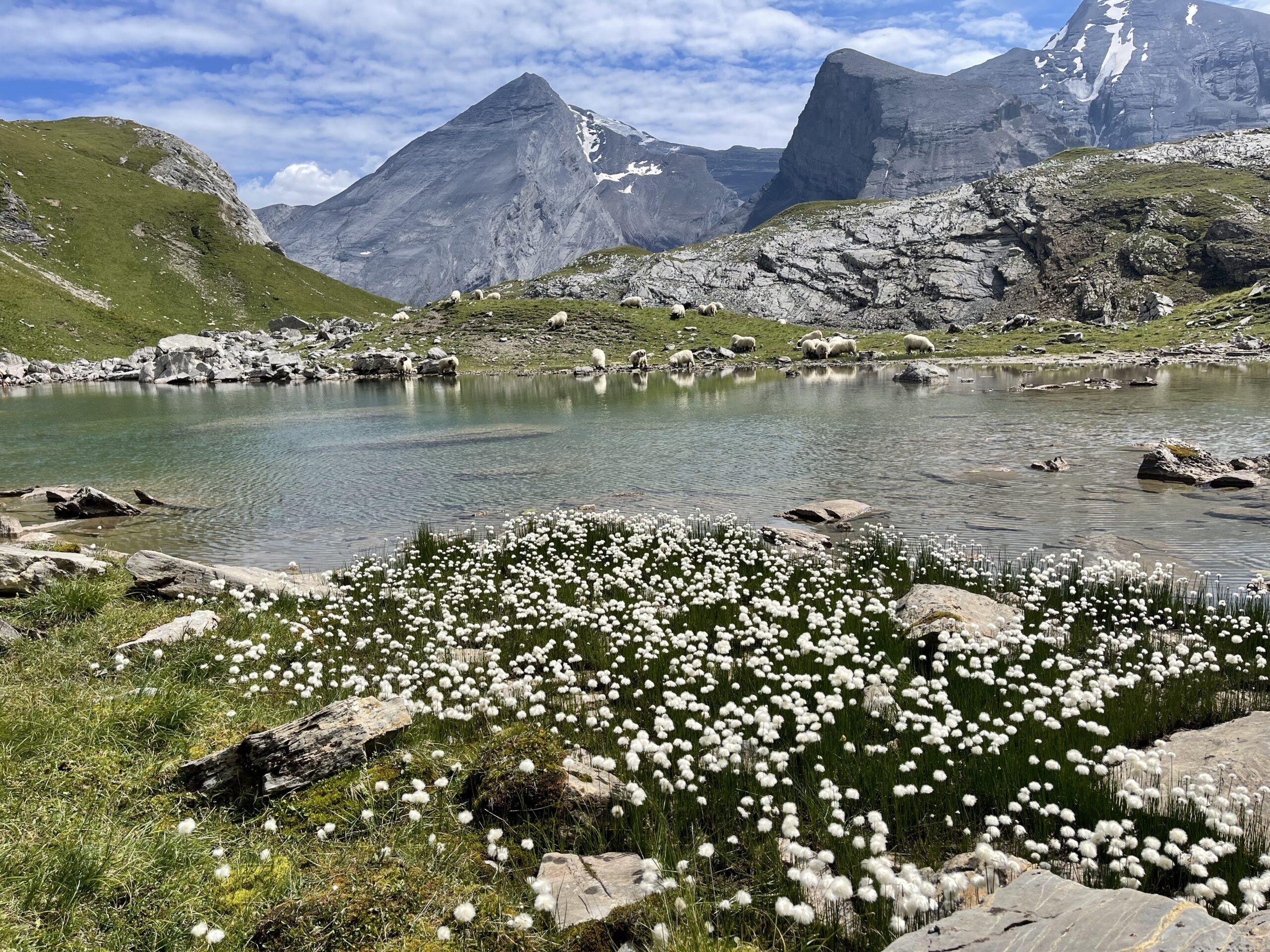 Die Erfahrung lehrt uns, Informationen von Passanten immer mit einer gewissen Skepsis zu begegnen. Dennoch, erfüllt von Besorgnis, dass „irgendwo“ unsere Alp, und das „Schaf“ eines unserer Herde sein könnte, machen wir uns so schnell wir nur können auf den Weg. Wir wählen die Route mit der besten Aussicht – dem anfänglichen Nebel zum Trotz. Endlich angekommen suchen wir zunächst unsere Alp ab. Aber wir finden kein Schaf in einer Felsspalte. Unsere Herde befindet sich friedlich aneinander gekuschelt in der Mittagsruhe.