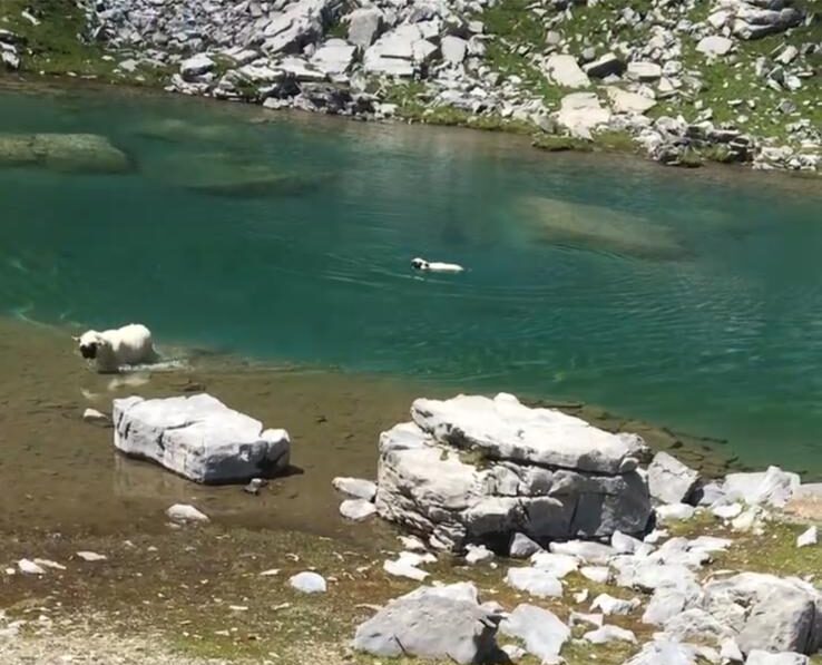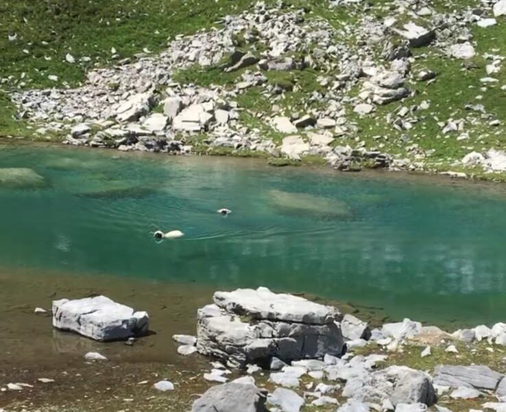 Wusstest du, dass Schafe freiwillig schwimmen gehen? Wir auch nicht… bis wir es erlebten. Zunächst sprang ein erwachsenes Schaf kurzerhand ins Wasser, um zu einem Teil der Herde auf der anderen Seite des Sees zu gelangen. Angelockt von Mamas Ruf auf der anderen Seite, machte es ihm ein kleines Lamm kurzerhand nach.